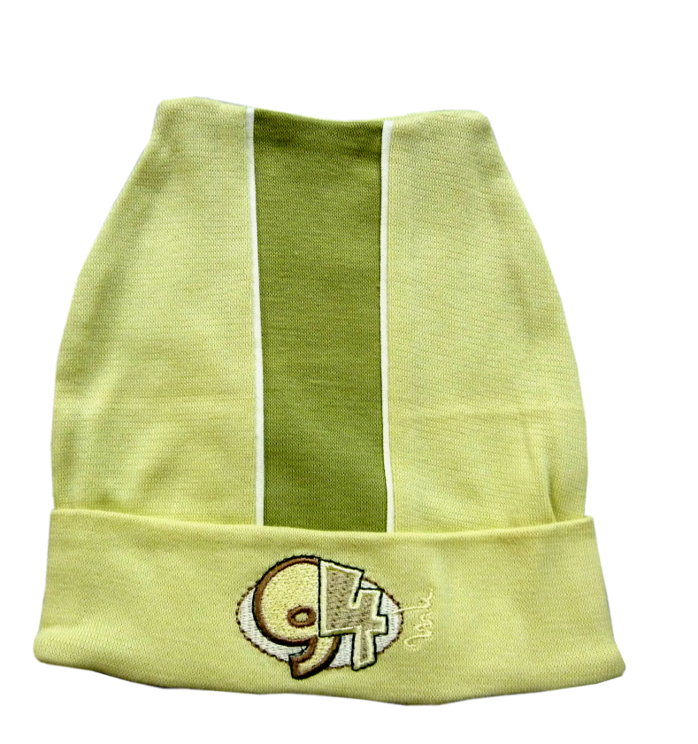 • Bawełniana, elastyczna czapka niemowlęca, z wstawką innego koloru, z małym haftem na przodzie. Uniwersalna, wiosenno-jesienna; wyprodukowana przez "MK Golińscy" w Polsce.