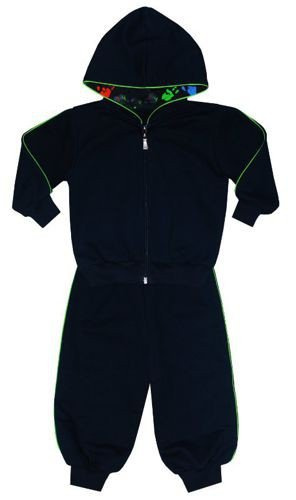- Komplet bawełniany dla chłopca z cienkiej "dresówki" o prostym kroju, za to z kilkoma cięciami wzdłuż których wszyto odblaskowe wypustki. Kurtka z kapturem, jest ozdobiona kolorową wyściółką kaptura. Bluza i spodnie zakończone są ściągaczami.