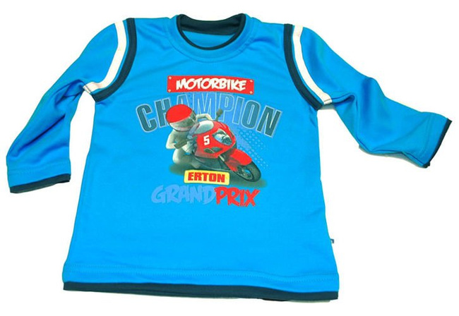 - Chłopięca bluzka z długim rękawem- marki "MK GOLIŃSCY", dwukolorowa, z kontrastowymi wstawkami na rękawach. Bluzka jest ozdobiona nadrukiem z motywami samochodów sportowych, zakończona przy szyi ściągaczem; gramatura 165.
