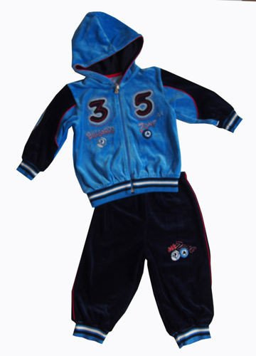- Komplet z weluru marki "MK GOLIŃSCY", z jaśniejszą bluzą. Obie części kompletu zakończone są ściągaczami w paski i haftowane.