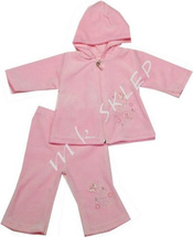 • Śliczny, dziewczęcy komplecik welurowy (bluza z kapturem i rozszerzane spodnie) - produkcji "MK GOLIŃSCY" w dziewczęcych kolorach; bluza rozpinana, rozszerza się ku dołowi i jest haftowana na przodzie i na nogawce w piękne motywy kwiatowe lub z motylami.