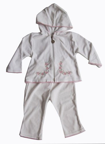 - Śliczny, dziewczęcy komplecik welurowy (bluza+spodnie) w dziewczęcych kolorach; bluza rozpinana z kapturem, haftowana na przodzie, obie części kompletu mają rozszerzane zakończenia, czyli-dół bluzy, rękawy i nogawki są zakończone kroszetką.
